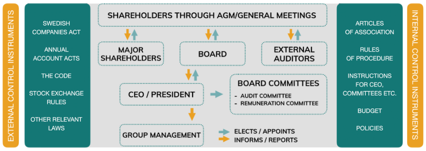 På årsstämma/bolagsstämma är det aktieägarna som gör de val och sätter upp de riktlinjer som utgör grunden för Acrouds bolagsstyrning. Nedanstående organisationskarta sammanfattar hur bolagsstyrningen är organiserad i Acroud.