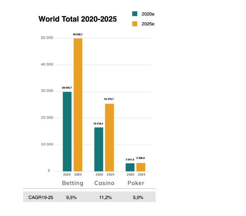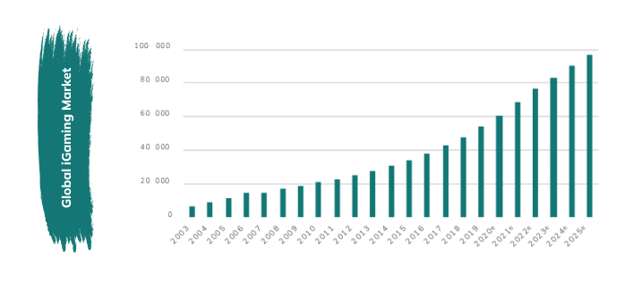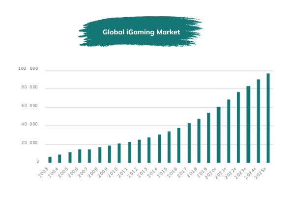 Värdet av den globala iGaming-marknaden uppskattas av H2GC till 69,6 miljarder EUR under 2021. Under åren 2021–2025 förväntas den totala iGaming-marknaden växa med 10 procent per år.